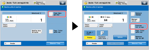 Il n'est possible de sélectionner le mode Séparations que si l'on sélectionne plusieurs fichiers et que l'on définit le mode Fusionner les fichiers et imprimer. (Voir "Fusion des fichiers lors de l'impression".) Il est impossible d'imprimer sur les séparations. Il est impossible de comptabiliser les séparations comme des impressions. Pour régler à la fois Ajouter couverture et Séparations, sélectionner le même format de papier. |