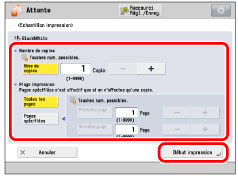 Si l'on sélectionne [Pages spécifiées], les numéros de page de la sortie sont spécifiés. Les numéros de page de la sortie peuvent différer de ceux de l'original. Si l'on sélectionne [Pages spécifiées], il est impossible d'activer le mode Agrafage, Perforation, Pli, Brochure ou Coupe. [Pages spécifiées] n'est valide que si le nombre d'impressions est 1. Il est impossible de remplacer le réglage [Toutes les pages] par [Pages spécifiées] ou inversement, une fois l'échantillon imprimé. Si l'on sélectionne [Pages spécifiées], il est impossible de modifier les pages spécifiées une fois l'échantillon imprimé. |