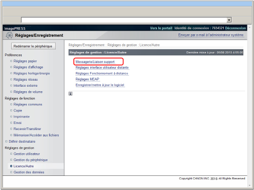 Activer la fenêtre d'affichage: | Pour afficher la messagerie dans une fenêtre contextuelle sur l'afficheur tactile. Si [Affichage sur page d'accueil] est sélectionné, la messagerie s'affiche sur la page de portail de l'interface utilisateur distante. |