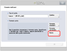 Se viene visualizzata una schermata che chiede di regolare le guide scorrevoli, regolare la larghezza delle guide scorrevoli → specificare il formato carta → premere [OK]. ![]() Se viene visualizzata una schermata che chiede di regolare le guide scorrevoli o di controllare [Impostazioni predefinite vassoio multiuso] in Impostazioni/Registrazione, regolare la larghezza delle guide scorrevoli in base al formato carta memorizzato in [Impostazioni predefinite vassoio multiuso] oppure impostare [Impostazioni predefinite vassoio multiuso] su 'Off' in [Preferenze] (Impostazioni/Registrazione). (Vedere "Registrazione delle impostazioni predefinite del vassoio multiuso".) ![]() |