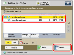 Non è possibile stampare più file contemporaneamente. Per stampare più file, selezionare e stampare un file per volta. Se si imposta 'Off' per <Blocco in memoria I-Fax>, i file ricevuti con la funzione I-fax vengono stampati automaticamente ed eliminati dalla mailbox RX memoria. |