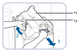 *1 Unità di pinzatura a sella *2 Cartuccia punti | 1. Afferrare l'impugnatura dell'unità di pinzatura a sella ed estrarla fino all'arresto. |