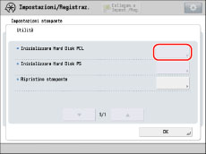 Il disco fisso non può essere inizializzato nei seguenti casi: Se è in corso la ricezione o la stampa dei dati (si consiglia di scollegare il cavo che collega la macchina all'hub, in modo che non vengano ricevuti dati di stampa). Durante l'installazione o la disinstallazione di font. Di seguito viene descritta la procedura di inizializzazione della partizione del disco fisso PCL. Per inizializzare la partizione del disco fisso PS, seguire la stessa procedura, con la differenza che al punto 4 occorre selezionare [Inizializzare Hard Disk PS]. |