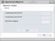 Il disco fisso può essere inizializzato solo dall'amministratore. Per eseguire questa procedura, rivolgersi all'amministratore. Quando si inizializza il disco fisso, le informazioni relative ai font o alle macro scaricati vengono eliminate dal disco fisso. Non spegnere la macchina mentre è in corso l'inizializzazione del disco fisso. Diversamente, la macchina potrebbe subire dei danni. |