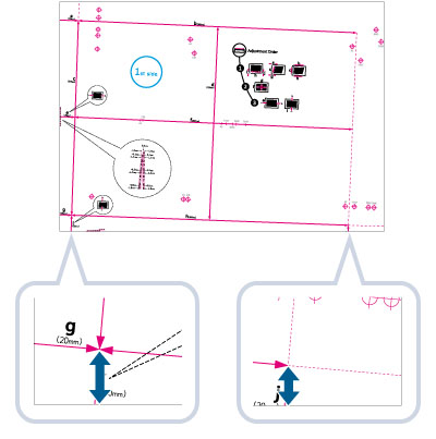 Per regolare la posizione dell'immagine sui fogli lunghi, stampare una pagina di test per fogli lunghi. La regolazione può essere effettuata in modo più efficiente rispetto all'uso della pagina di test stampata da [Stampa pagina di test] in <Correzione disallineamento immagine>. (La pagina di test per fogli lunghi è disponibile sul sito web del manuale in linea.) |
