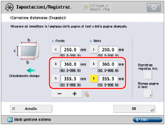 Utilizzando i due valori numerici e "c = 250,0", una periferica regola la lunghezza per correggere la distorsione dell'area di stampa.