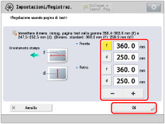 [f]: | Immettere la lunghezza misurata del segno 'f' sulla pagina di test. Per il foglio lungo: immettere il valore calcolato dalla lunghezza misurata del segno 'f' sulla pagina di test per fogli lunghi. Valore da inserire = ((valore 'f' predefinito: 360 mm)/posizione 'f' misurata: 450, 550, 650 mm)) x valore 'f' misurato |