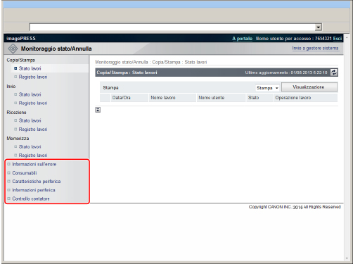 Caratteristiche periferica: | vengono indicati gli accessori opzionali (ad esempio il finisher) installati e le funzioni disponibili con la configurazione di sistema utilizzata. |