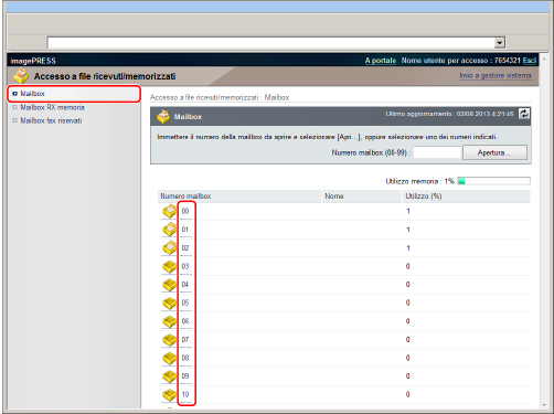 Fare clic su [Accesso a file ricevuti/memorizzati] → selezionare [Mailbox] → fare clic sul numero della mailbox desiderata.