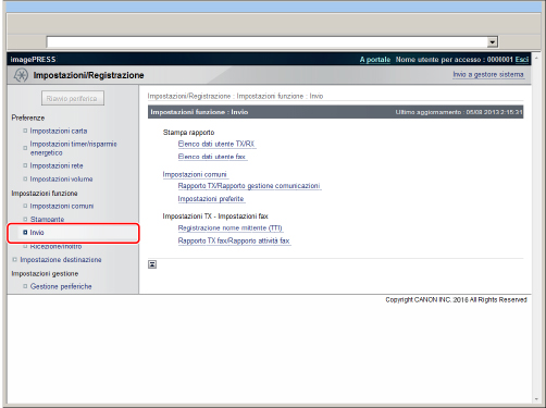Fare clic su [Impostazioni/Registrazione] → selezionare [Invio] per <Impostazioni funzione>.