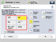 → [Scansione e invio] → specificare la destinazione → premere il pulsante del formato del file.