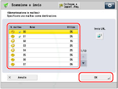 È possibile specificare una sola mailbox alla volta come destinazione. Per poter inviare un link a una mailbox tramite e-mail, è necessario prima registrare un indirizzo di e-mail per la mailbox. (Vedere "Impostazioni della mailbox".) Se è impostata la modalità Invio URL, non è possibile effettuare l'invio a un indirizzo di gruppo che include una mailbox come destinazione. |