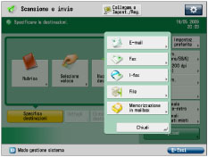 È possibile impostare la macchina per visualizzare la funzione Fax nella schermata Menu principale. Se si desidera che la funzione fax venga visualizzata nella schermata Menu principale, è possibile selezionare se visualizzarla o meno in [Scansione e invio]. Visualizzando la funzione fax in [Scansione e invio] è possibile effettuare invii a diverse destinazioni utilizzando metodi differenti, ad esempio e-mail e I-fax, contemporaneamente.