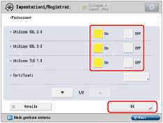 Non è possibile utilizzare TLS se <Utilizzo SSL 2.0>, <Utilizzo SSL 3.0> e <Utilizzo TLS 1.0> sono impostati su 'Off'. |
