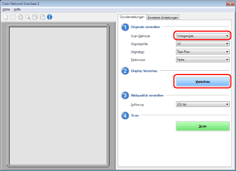 Wählen Sie [Vorlagenglas] unter [Scan-Methode] → Klicken Sie auf [Vorschau].
