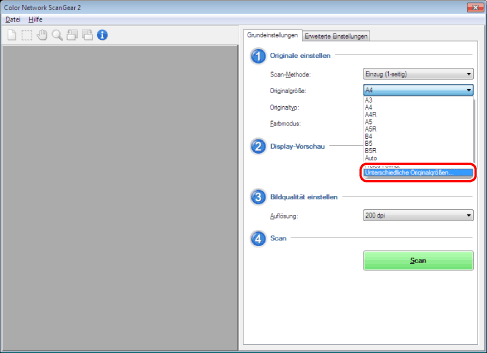 Wählen Sie [Unterschiedliche Originalgrößen] unter [Originalgröße].