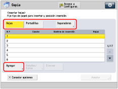 No es posible seleccionar [Hojas] y [Portadillas] al mismo tiempo. Antes de alimentar papel desde la Unidad de Inserción N, cargue papel en la Unidad de Inserción N y especifique el tamaño del papel. Para especificar el número de separadores, cargue papel de separadores en la Unidad de Inserción N, seleccione [Separadores], y después pulse [N.º de pest.]. |