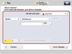 Si realiza una nueva búsqueda de destinos cuando ya hay un resultado de búsqueda en la pantalla de lista de destinos, desaparecerá el resultado mostrado. Si se muestra el resultado de la búsqueda para criterios especificados, el resultado de la búsqueda se borra y la búsqueda se procesa para todos los criterios al pulsar [Todo]. Si desactiva [Búsqueda automática al usar servidor LDAP], no aparece nada en la pantalla de lista de destinos hasta que se realiza una búsqueda. Si en la pantalla de lista de búsqueda aparece un resultado de búsqueda de [Buscar por condición], no podrá pulsar adicionalmente [Buscar por nombre] para limitar la búsqueda por nombre. Si un destino está guardado con una dirección de e-mail y un número de fax, podrá buscar el número de fax introduciendo la dirección de e-mail como criterio de búsqueda. |