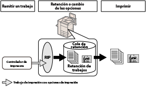 Un trabajo presentado se guarda en la Cola de retención. Los trabajos de la Cola de retención ya han completado el proceso RIP (Procesador de imágenes de trama). Puede imprimir cualquier trabajo guardado en la Cola de retención.