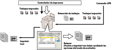 Esta función le permite guardar temporalmente los datos de trabajos de impresión en una cola en el buzón de retención (Cola de retención) especializada para la función Retener trabajos.