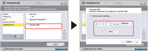 Pulse [Comando PING] para [Opciones de IPv4] → introduzca una dirección IPv4 que exista en la red → pulse [Inicio].