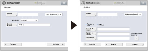 Se pueden introducir hasta 128 caracteres alfanuméricos para [Nombre de host] en el panel de control. Para [Ruta de la carpeta], se pueden utilizar hasta 255 caracteres alfanuméricos. Especifique las opciones del servidor según los límites de caracteres. Si cambia el idioma de la pantalla táctil, puede que las opciones [Nombre de host] y [Ruta de la carpeta] no aparezcan correctamente. Si el idioma de la pantalla táctil no coincide con el del ordenador utilizado como navegador maestro, puede que las opciones [Nombre de host] y [Ruta de la carpeta] no aparezcan correctamente, o que no pueda explorar los directorios. Para enviar a un host IPv6, establezca [Nombre de host] con el siguiente formato: <Dirección IPv6>:<Número de puerto> Ejemplo: 5aed:90a0:bc05:01d2:568a:2fc0:0001:12ee:21000 |