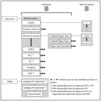 El menú Opciones de impresora permite acceder a opciones comunes. A continuación se muestra un esquema abreviado de la estructura del menú Opciones de impresora.