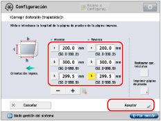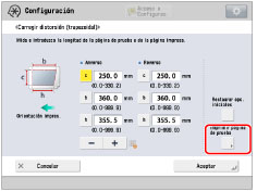 [b]: | Introduzca la longitud medida de la marca 'b' en la página de prueba (en el caso de la hoja larga: la longitud medida de la marca 'b' más cercana al borde final del papel). |