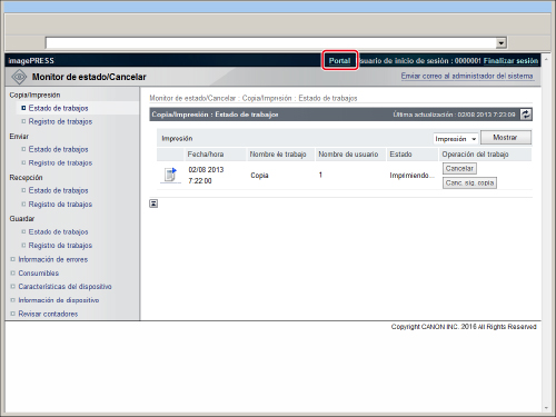 Para volver a la parte superior de la página, haga clic en [Portal]. Se muestra información, como el estado del equipo o el nombre del producto.