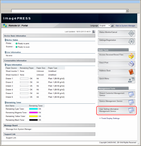 Haga clic en [User Setting Information Management Service] desde las herramientas de gestión.