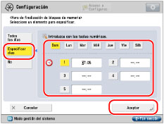 Si selecciona [Todos los días], seleccione un número ([1] a [5]) → introduzca la hora de inicio con