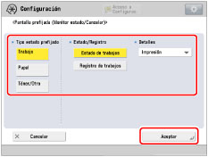Si establece [Trabajo], [Estado de trabajos], [Impresión] como Pantalla prefijada (Monitor estado/Cancelar):