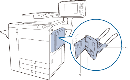 Cuando quite el papel atascado de la unidad de transporte de fijación mientras esté utilizando la Bandeja de Alineación para la Bandeja de Alimentación D y la Opción de Alimentación para Originales de Longitud especial (Banners) B, deje la Bandeja de Alimentación C abierta y tire suavemente de la unidad de transporte de fijación. En la ilustración siguiente se indica la ubicación del atasco de papel. Consúltela para quitar el papel atascado. ![]() *1 En la bandeja de la bandeja de alimentación *2 Dentro de la tapa de la bandeja de alimentación |