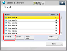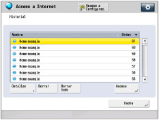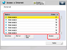 En función de la página web, el nombre puede estar en blanco. Si se muestra un archivo de imagen, el nombre se queda en blanco. Seleccione [Nombre] u [Orden] para clasificar el historial de URL en orden ascendente o descendente. |
