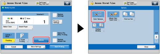 Specify the color balance, saturation, hue, and density settings that you want to store → press [Recall/Register].