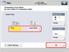 To set the size for the transparencies to output, press [Change] for <Transp. Size> → select the transparency size → press [OK].