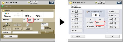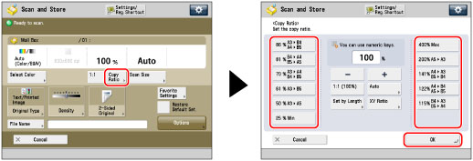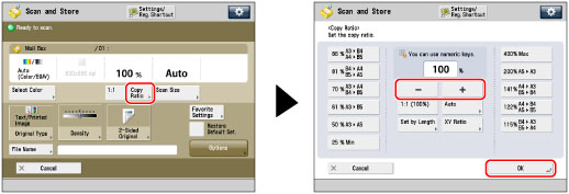 Press [Copy Ratio] → adjust the zoom ratio using [-] and [+] → press [OK].