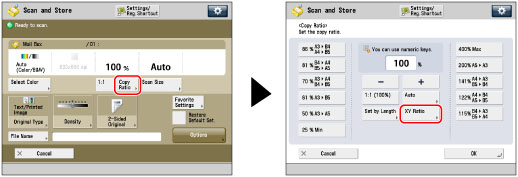 You can enlarge or reduce originals by any zoom ratio in 1% increments. The available zoom ratios are from 25% to 400% for the Mail Box function, and from 50% to 200% for the Memory Media function. The same zoom ratio is used for the horizontal and vertical axes.
