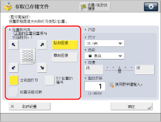 如果在[复印套编排选项设置]中将<编排选项>设置为“打开”,则[全表面打印]和[5个位置的编号]变灰且无法选择。(请参阅“复印套编排选项”) 如果在同一位置设置了[页码编排]、[水印]或[打印日期]中的任意两个进行打印,则按 (启动)时将显示一条确认信息。 |