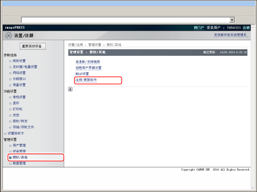 按[管理设置]→[授权/其他]→[注册/更新软件]。