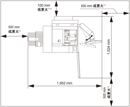 *1 请确保本机后侧预留至少100 mm或以上大小的空间进行无障碍的操作。如果安装 Stack Bypass Alignment Tray-C2 和 Long Sheet Tray-B1组件,请确保提供至少200 mm大小的空间。