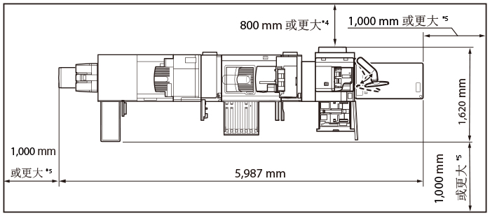 *5 请确保预留至少1000 mm或以上大小的空间进行维修作业。此外,如果未安装如上图所示前述的传送/拾取系统选配件,请确保提供至少500 mm大小的空间。