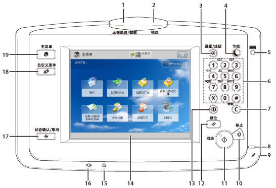 14. | 触摸面板显示屏幕 该显示屏幕显示每项功能的设置屏幕。默认显示八个功能键。 |