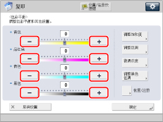 选择要调整的色彩→按[-]或[+]调整深(高)、中和浅(低)浓度区域的浓度等级→按[确定]。