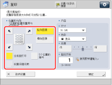 如果将[编排选项设置为“打开”,[全表面打印]和[5个位置的编号]会变灰并且无法被选择。(请参阅“复印套编排选项”) 如果在同一位置设置了[页码编排]、[水印]或[打印日期]中的任意两个进行打印,则按 (启动)时将显示一条确认信息。 |