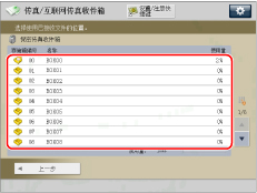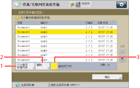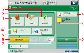 1 | 选择全部(最多32份文件)/清除选择 按下可以选择收件箱中的所有文件。如果选择了文件,该键变为[清除选择]。 |