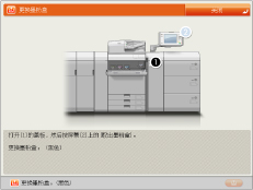 有关如何更换墨粉盒的完整说明,可通过按触摸面板显示屏幕上的[上一步]或[下一步]获取。 如果在打印作业过程中墨粉用尽,剩余的打印作业将在更换墨粉盒后进行。 更换墨粉盒后,如果打印出的颜色和更换墨粉盒前打印的颜色不同,请从“设置/注册”的[调整/维护]中执行[自动调整渐变]。(请参阅“自动渐变调整”) |