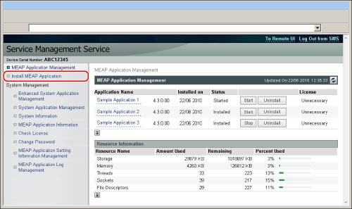 如果正在将现有的MEAP应用程序升级为更新的版本,在安装新版本之前停止该应用程序。如果不先停止,则无法更新该应用程序。(请参阅“启动/停止应用程序”) 最多可以安装19个应用程序。 最多可以为安装MEAP应用程序分配1 GB的硬盘空间。 可以在[Storage](硬盘空间)页面中显示的[Resource Information](资源信息)下的[MEAP Application Management](MEAP应用程序管理)中确认分配给MEAP应用程序的硬盘空间。 根据安装的应用程序,安装时可能有其他系统要求。有关详细信息,请参阅应用程序随附的手册。 如果安装应用程序时本机执行关机操作,则SMS的“Install”(安装)页面上可能显示错误信息,并且安装可能被取消。在这种情况下,请在本机重新启动(关闭主电源开关,然后再次打开)后再次安装MEAP应用程序。有关打开/关闭本机的说明,请参阅“主电源键和节能键”。 安装应用程序后,根据不同的应用程序,已安装应用程序的图标可能出现在触摸面板显示屏幕的“主菜单”屏幕上。如果“主菜单”屏幕上未显示已安装应用程序的图标,按[显示全部]切换显示屏幕。如果未显示[显示全部],请参阅“设置主菜单屏幕”。 |