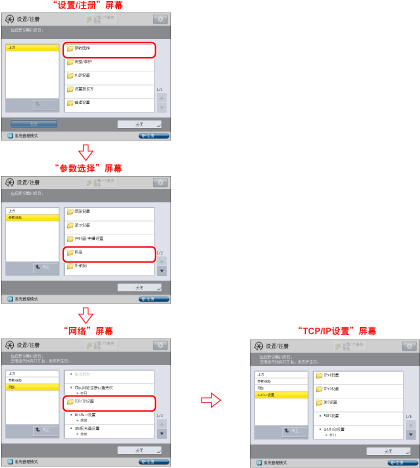 (设置/注册)并使用触摸面板显示屏幕以管理员身份登录,为本机指定网络设置。有关管理员类型的信息,请参阅“管理员设置”。在[参数选择]的[网络]中指定设置,以适合网络环境。以下屏幕拍图说明指定网络设置的操作流程。