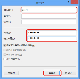 在[新用户]对话框中的[用户名]内输入用户名→在[密码]中输入密码→在[确认密码]中再次输入密码→单击[创建]。